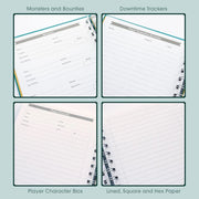 Le carnet de notes Game Master’s Quest contient 120 pages de papier à lettres RPG personnalisé. Il est compact, résistant à l'usure et relié en fil, il est donc facile à plier en deux et repose toujours à plat sur la table. Une sangle élastique et une poche arrière permettent de garder vos notes et vos documents en sécurité entre les sessions.