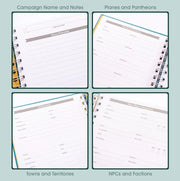 Nos journaux de quête de maître de jeu sont spécialement conçus pour garder une trace de vos notes de campagne et de vos documents. Il a tout ce dont vous avez besoin pour gérer vos campagnes D&D sans transpirer. Il y a de la place pour les notes de construction du monde, les feuilles de planification de session et les traqueurs pour les PNJ, les monstres, les objets magiques, les règles de la maison et plus encore ! Plus du papier ligné, pointillé et carré, et deux tailles de grilles hexagonales pour planifier des cartes et des donjons.