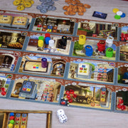 Welcome to the hustle and bustle of the bazaar district of Istanbul! Merchants and their assistants are hurrying through the narrow alleys attempting to be more successful than their competitors. Good organization is key: Wheelbarrows have to be filled with goods at the warehouses and then swiftly transported to the various destinations by the assistants. The goal of the merchants is to be the first to collect a certain amount of rubies.Istanbul: Big Box is the All-in-1 package for Istanbul, including the base game as well as both expansions, Mocha & Baksheesh and Letters & Seals. This combination also gives players the option to play on a big 5 x 5 tiles bazaar.